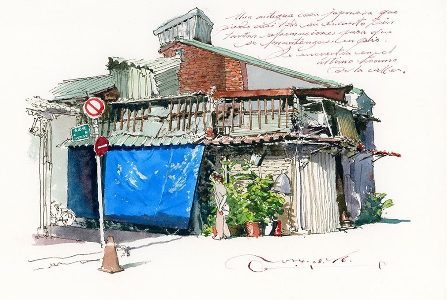 因為地理位置的關係,每到午後當太陽偏斜的時刻,陽光便會直射這棟小屋,讓原本全身打上補丁舖了帆布的老房子,像是罩上一層魔法一般地閃亮了起來,那身上披掛的一切似乎都成為理所當然的細節,原本的紊亂在光線與毫不含糊的影子的相互搭配下,搖身成為目光停留跟搜索的地方,說美似乎太乏,倒不如認它做迷人。