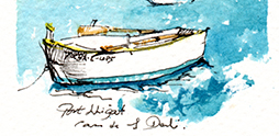 車子開到卡達克斯城外,城裡的白色大教堂被同樣也漆成白色的房子成群簇擁,再往後就是那片美麗湛藍的海灣,以及海灣背後的小丘陵。 我看著這面美麗的海灣,再看看公路上指著前方的路標——利加特,我決定不進去卡達克斯,我要一路開到利加特,那是達利在地中海邊最小的一個博物館之所在。利加特是一個只有幾戶人家的小漁村,很難想像達利就住在這個小漁村裡,在他的作品裡,利加特及其周邊那不毛的岩石丘陵不斷出現。 我在他的故居前,和一堆不同國籍的訪客遇到了同樣的問題,那就是不得其門而入,西班牙的時刻表真是個煩人的東西,反正今天就是不知為什麼不開放。我在故居前的石礫灘上席地而坐,拿出畫具把小海灣中的 小船畫下來,接著便繼續往東,向克雷烏斯岬角的極東端駛去。
