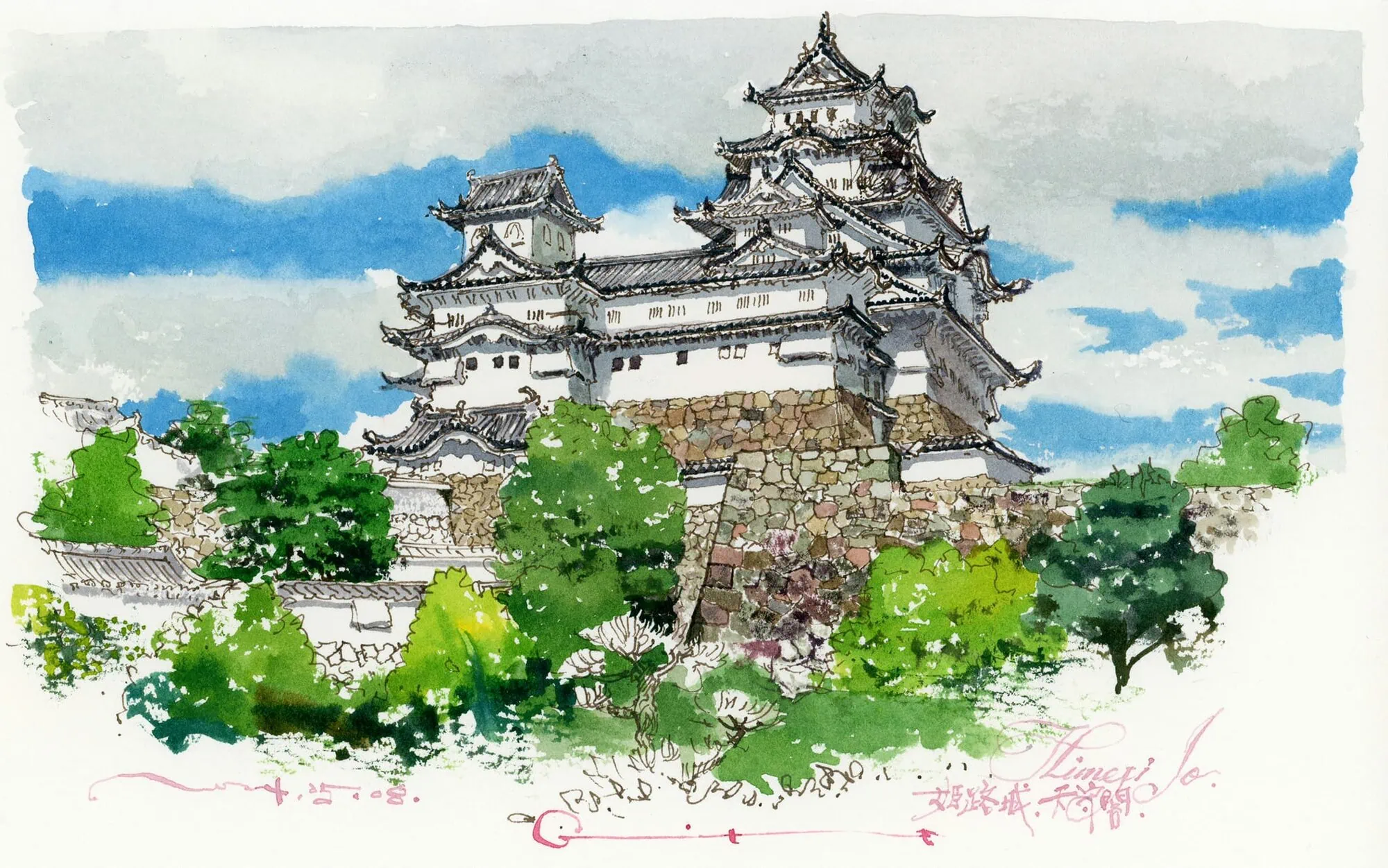 姬路城 這是當初在姬路城內輾轉申請了繪圖許可之後,坐在化妝櫓那邊的園子裡畫的,因為時間不多所以原圖只有線條,回國後參考當天拍攝的相片上色。