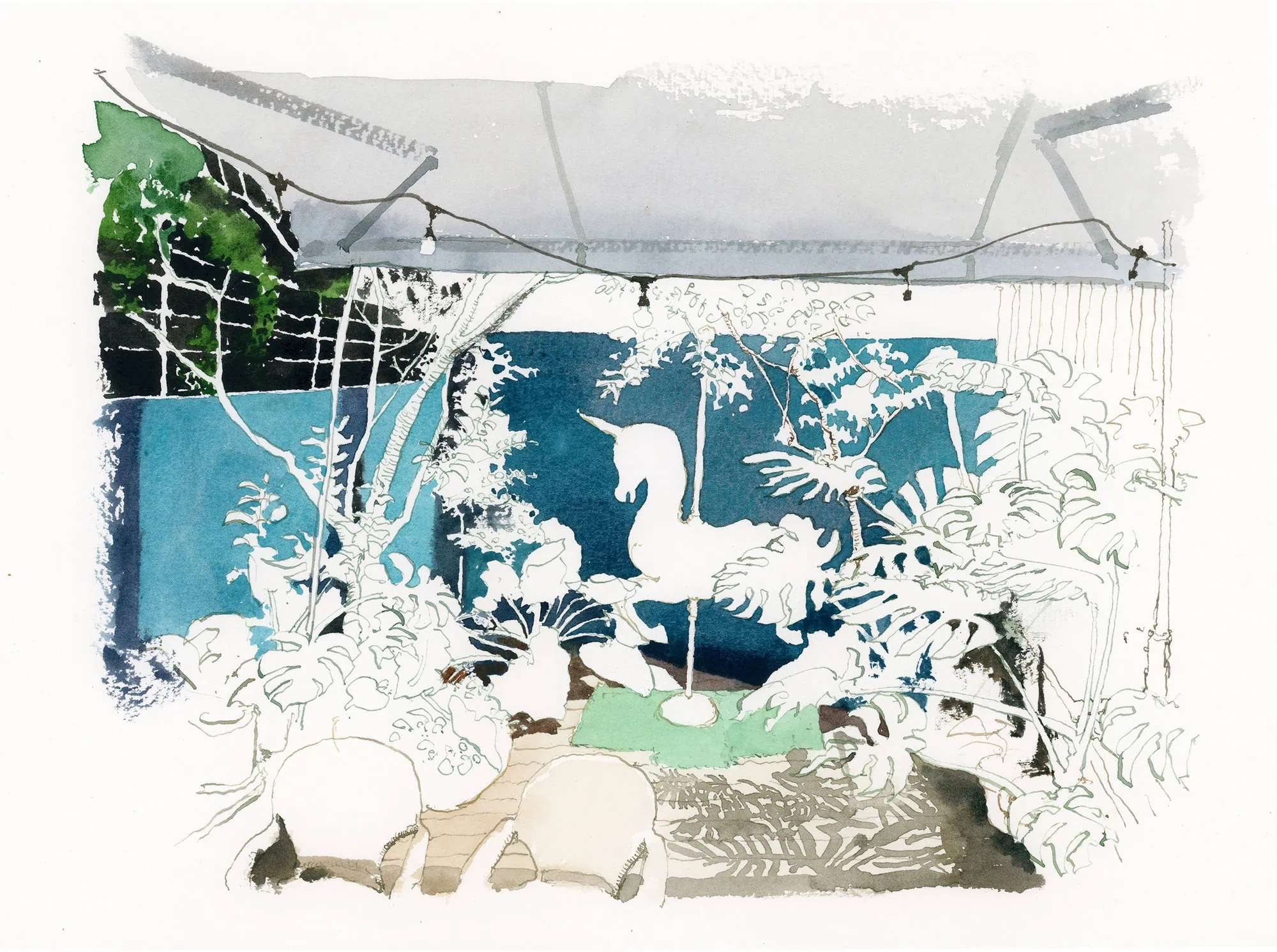 陽光靜靜停留在畫紙上,陰影也悄悄佔據一角。時間在這裡流動得很慢,色彩、線條、形狀,一筆一筆交織成紙上的風景,描繪出一個未曾預料的美好片刻。