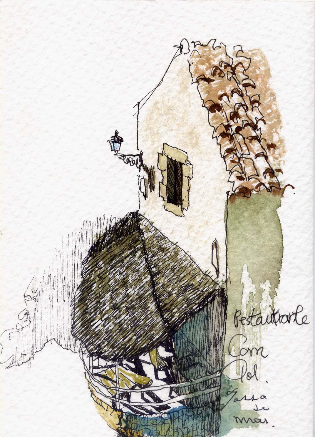 另一張圖則是我在多莎的另一頭,一個位在兩個岬角中的小沙灘旁畫的,下午開始西斜的陽光照在海面,以及城牆圓塔上,我在和煦的海風吹拂下完成這張小畫之後,便跑上城牆把小村子再細細的看上幾回。 末了,我把城牆邊的小酒館畫了下來,傍晚的酒館已經有許多人開始為電視的足球賽吆喝著,我閤上圖畫本,走到停車的地方,我心裡想著,我要找個安靜的小村子過夜。